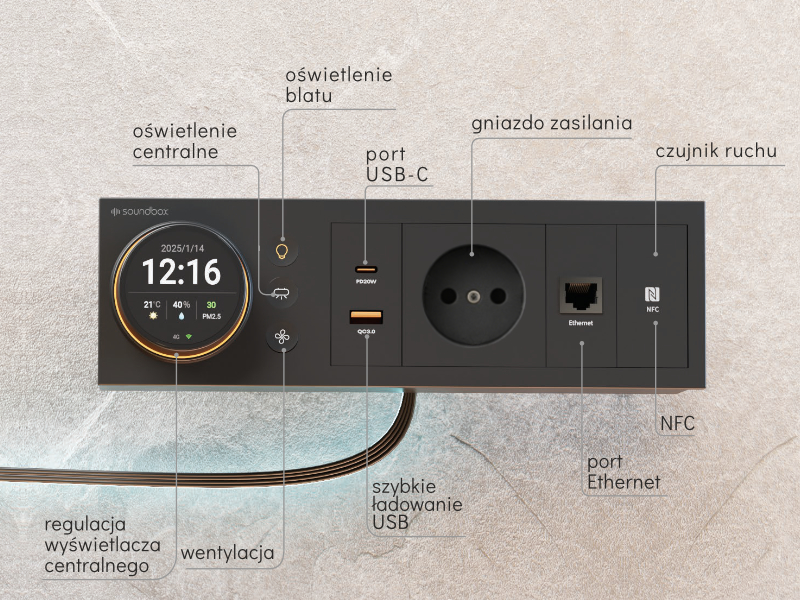 - Wyświetlacz informujący o dacie, czasie, temperaturze, wilgotności oraz jakości powietrza