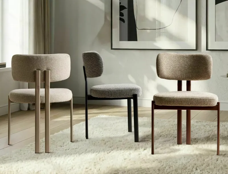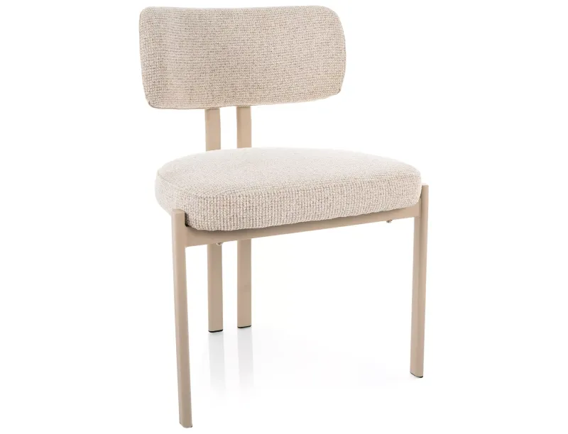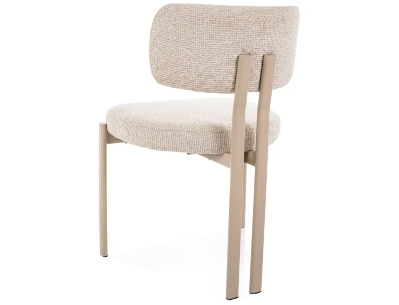 Miękkie, tapicerowane siedzisko wykonane z przyjemnej w dotyku tkaniny zapewnia wysoki komfort użytkowania nawet podczas dłuższego siedzenia. Wygodne oparcie odpowiednio podpiera plecy, zwiększając ergonomię i wygodę codziennego użytkowania. Stabilny metalowy stelaż w kaszmirowym, matowym wykończeniu podkreśla nowoczesny charakter krzesła.