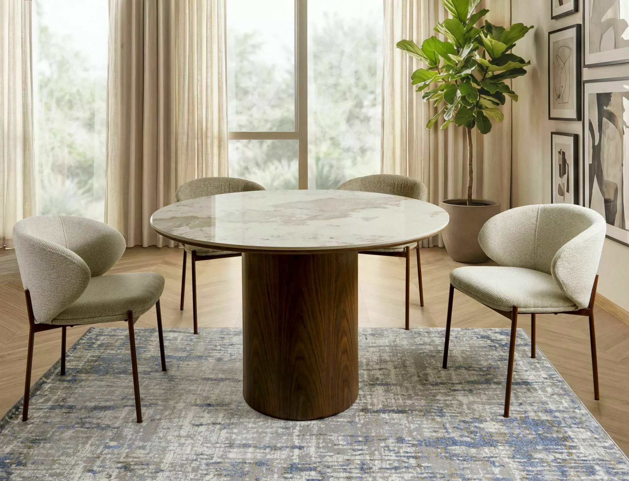 Stół RONDO to propozycja dla osób, które cenią wyrafinowany design i ponadczasową estetykę. Okrągły blat z efektownym wzorem inspirowanym marmurem przyciąga uwagę i nadaje wnętrzu wyjątkowego charakteru. To mebel, który naturalnie staje się centralnym punktem jadalni lub salonu.